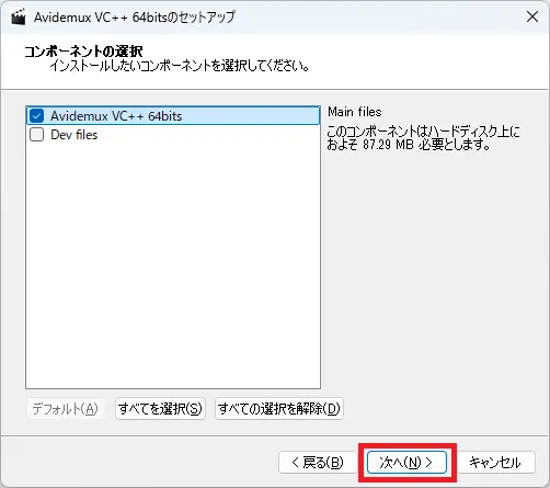 「コンポーネントの選択」画面が出ますのでそのままの状態で「次へ」ボタンをクリックします。