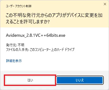 「ユーザー アカウント制御」画面が出る場合は「はい」ボタンをクリックします。