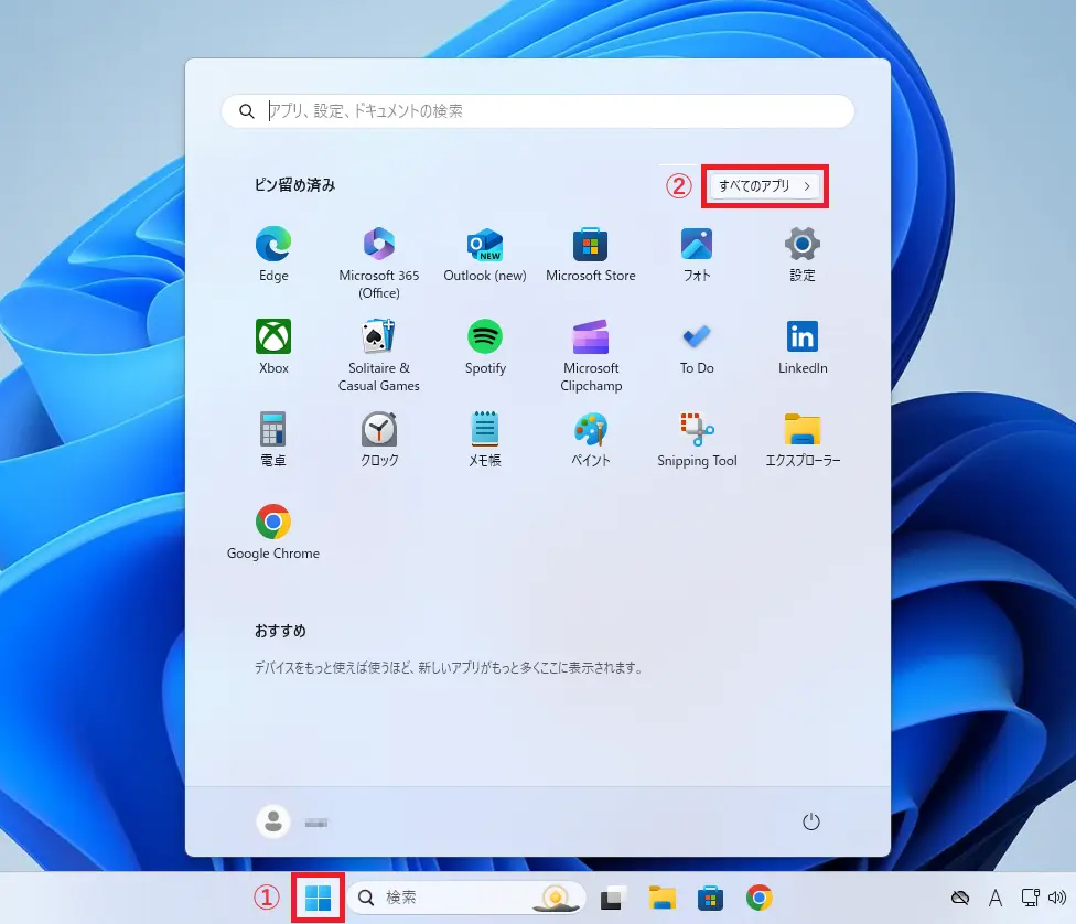 「スタート」ボタン-「すべてのアプリ」ボタンをクリックします。