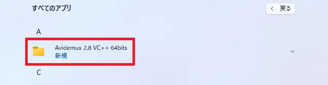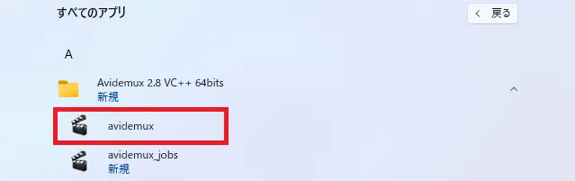 「Avidemux 2.8 VC++ 64its」-「avidemux」をクリックします。