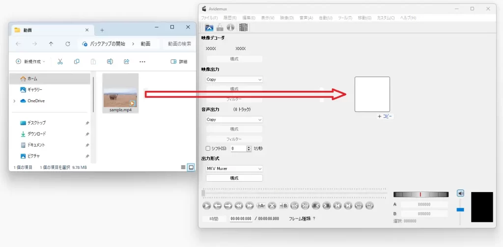 編集したい動画ファイルをAvidemux画面中央の何もないところにドラッグ&ドロップします。