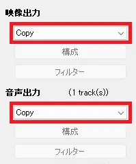 「映像出力」と「音声出力」が「Copy」であることを確認します。違っている場合はクリックして選択しなおします。
