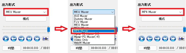 「出力形式」は元ファイルと同じものを選びますが、今回は一般的なMP4ファイルなので「出力形式」欄をクリックして「MP4 Muxer」を選択します。
