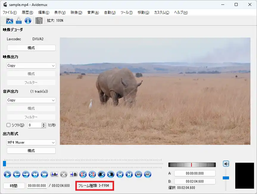 まず動画ファイルを読み込んだ状態で画面下側の「フレーム種類:」を確認します。
