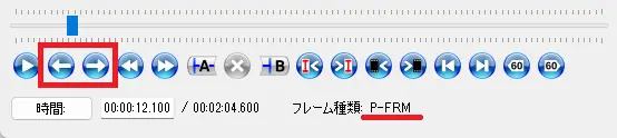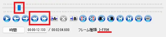 シークバーのハンドルをドラッグした場合と「前のキーフレームに移動」ボタンや「次のキーフレームに移動」ボタンをクリックした場合、「フレーム種類:」は常に「I-FRM」になっています。