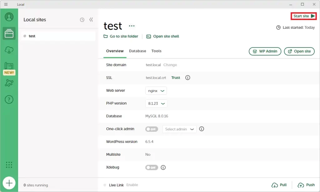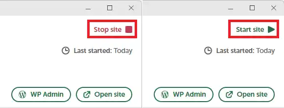 サイトを起動し直すので、Local画面右上の「Stop site」をクリックし、続けて「Start site」をクリックします。