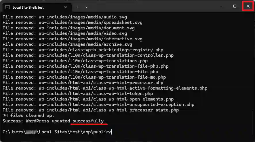 ファイルのダウンロード・バージョンの変更と進みます。「successfully.」(「Success: WordPress updated successfully.」)と出れば完了です。