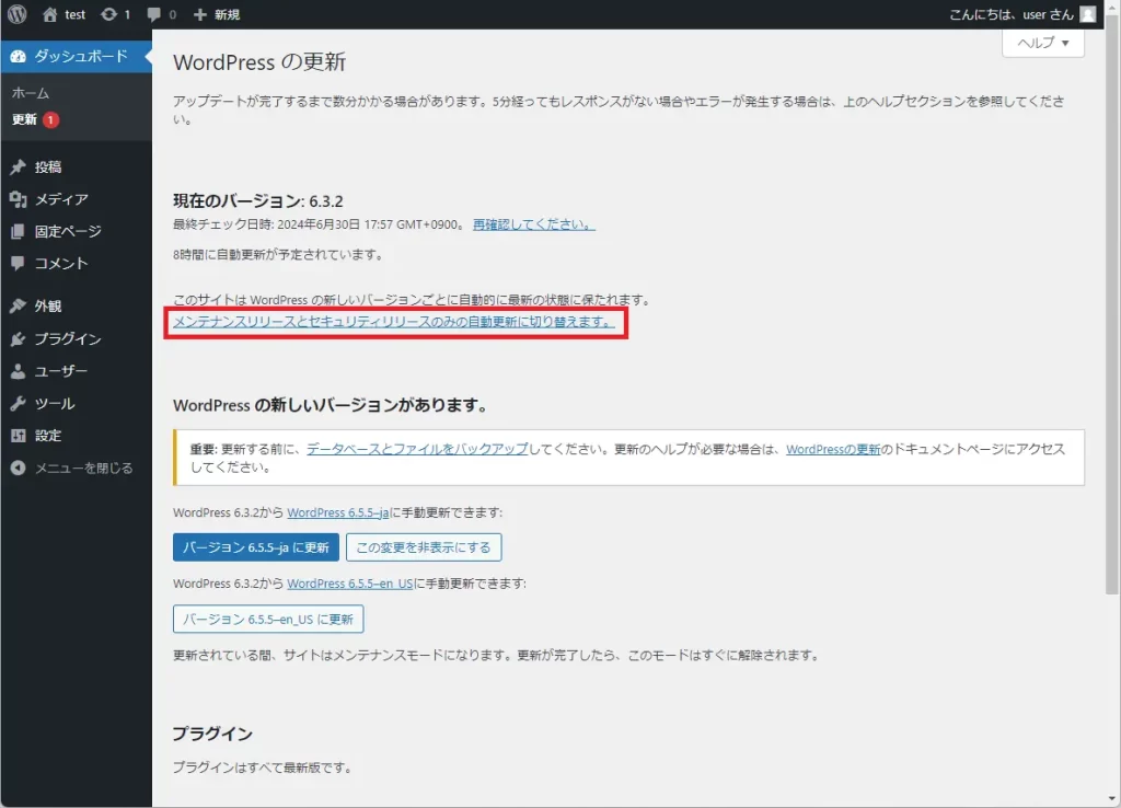 「メンテナンスリリースとセキュリティリリースのみの自動更新に切り替えます。」をクリックします。